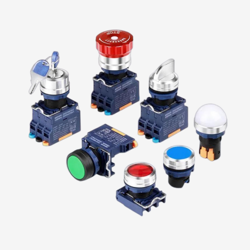 Basmalı buton anahtarları, basmalı anahtarlar, acil durdurma ve geçiş anahtarları dahil olmak üzere endüstriyel panele monte edilebilen çeşitli düğmeler ve anahtarlar sunuyoruz.